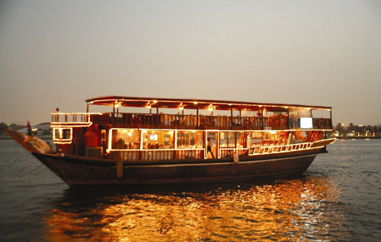 Dhow Cruise Dubai - Dhow Cruise is a way to explore Dubai while aboard a traditionally decorated wooden dhow, as it sails along the Dubai creek. One passes through the major Dubai landmarks as the wooden vessel slips silently across the creek. One passes through structures of the past and present architecture of the area including the National Bank of Dubai, Dubai Chamber of Commerce, Sheikh Saeed's house, and the Heritage Village.