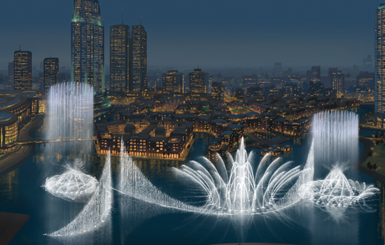 Dubai Fountain - The Dubai Fountain is the worlds largest choreographed fountain system set on the 30-acre manmade Burj Khalifa Lake. More than 6,600 lights and 25 colour projectors have been installed and offers guests a spectacular setup for the evening.